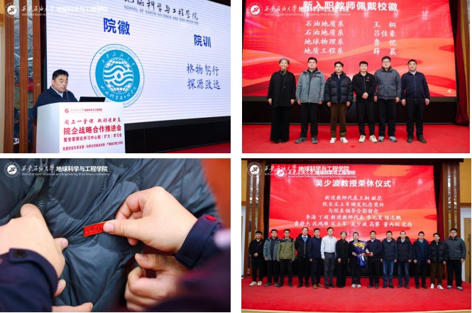 为贯彻落实学校“三个年”建设部署,深化“院所制”改革,12月22日,地球科学与工程学院“同上一堂课 砥砺谱新篇”院企战略合作推进会暨党委理论学习中心组(扩大)学习会在雁塔校区举行。会议以“党建赋能改革发展,科研协同驱动创新,产教融合聚力攻坚”为主线,通过联合研究院揭牌、前沿学术报告、专题思政课与学院内部建设系列议程,汇聚发展共识,擘画未来蓝图。校长王进富,长庆油田首席技术专家喻健,西安石文软件有限公司董事长、总经理张小会,副总经理杨静波,校友工作与合作交流处相关负责人等校企嘉宾及全院师生代表共同参会。学院党委书记高黎主持会议。